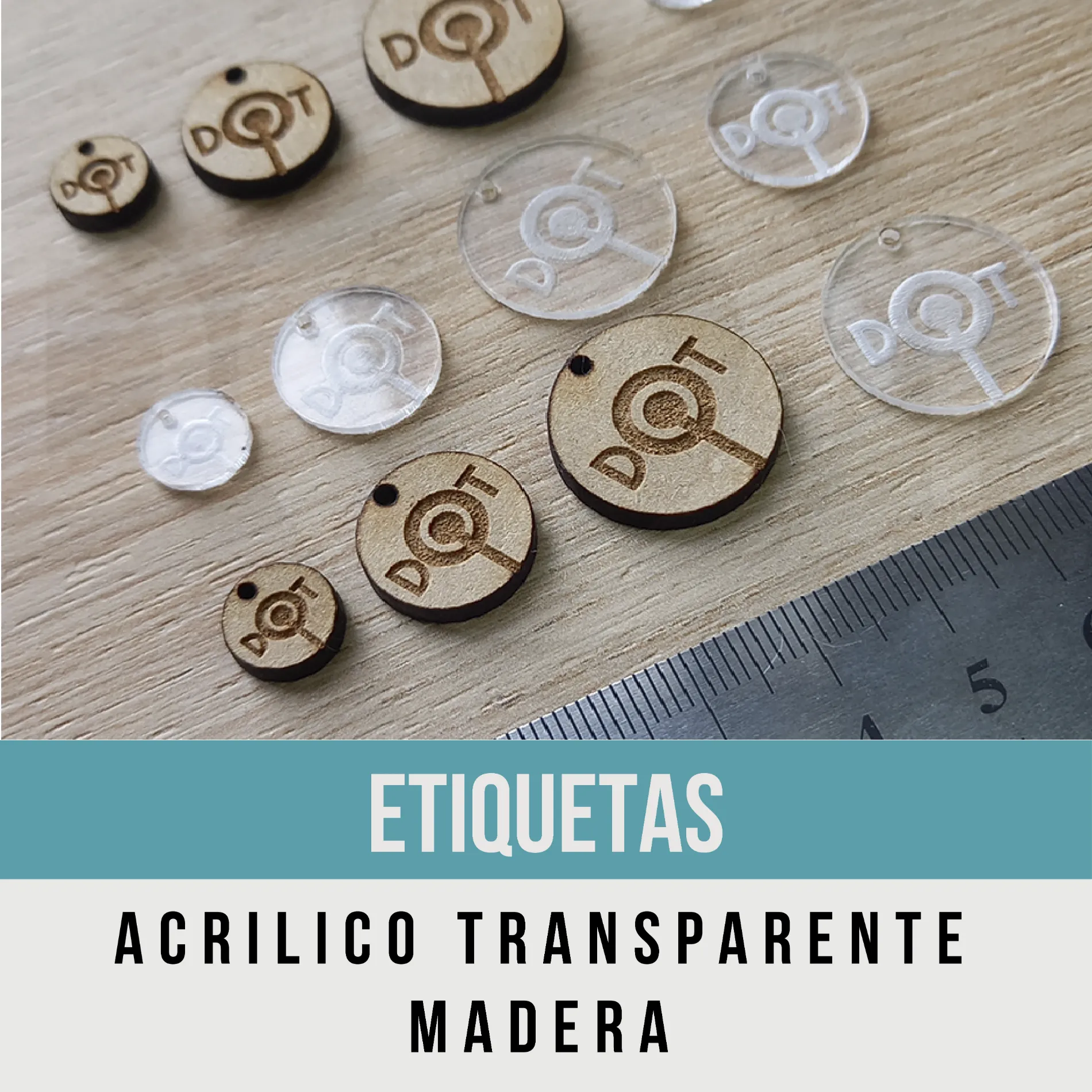 Etiquetas madera MDF y acrílico transparente – 2mm
